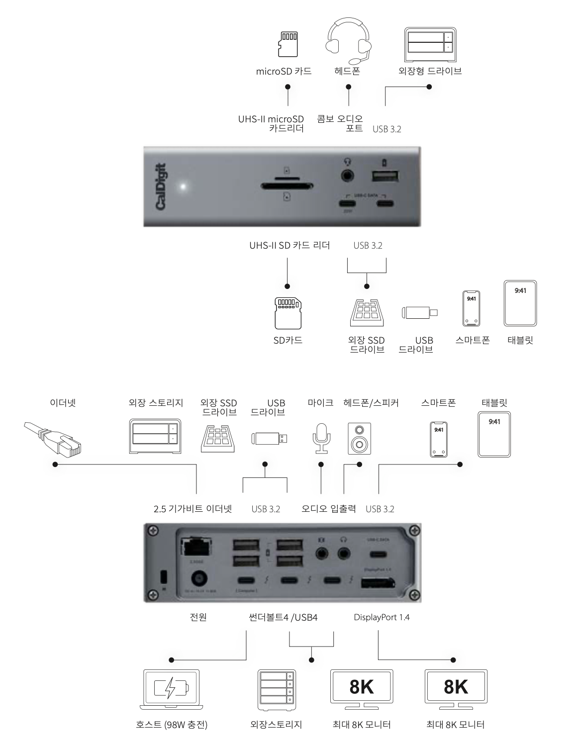 CalDigit TS4는 단순한 도킹스테이션을 넘어 프로페셔널 워크스테이션의 핵심 허브 역할을 합니다. 18개 포트의 압도적 확장성, 98W 전력 공급, 8K 디스플레이 지원이라는 삼박자가 완벽하게 조화를 이루죠.